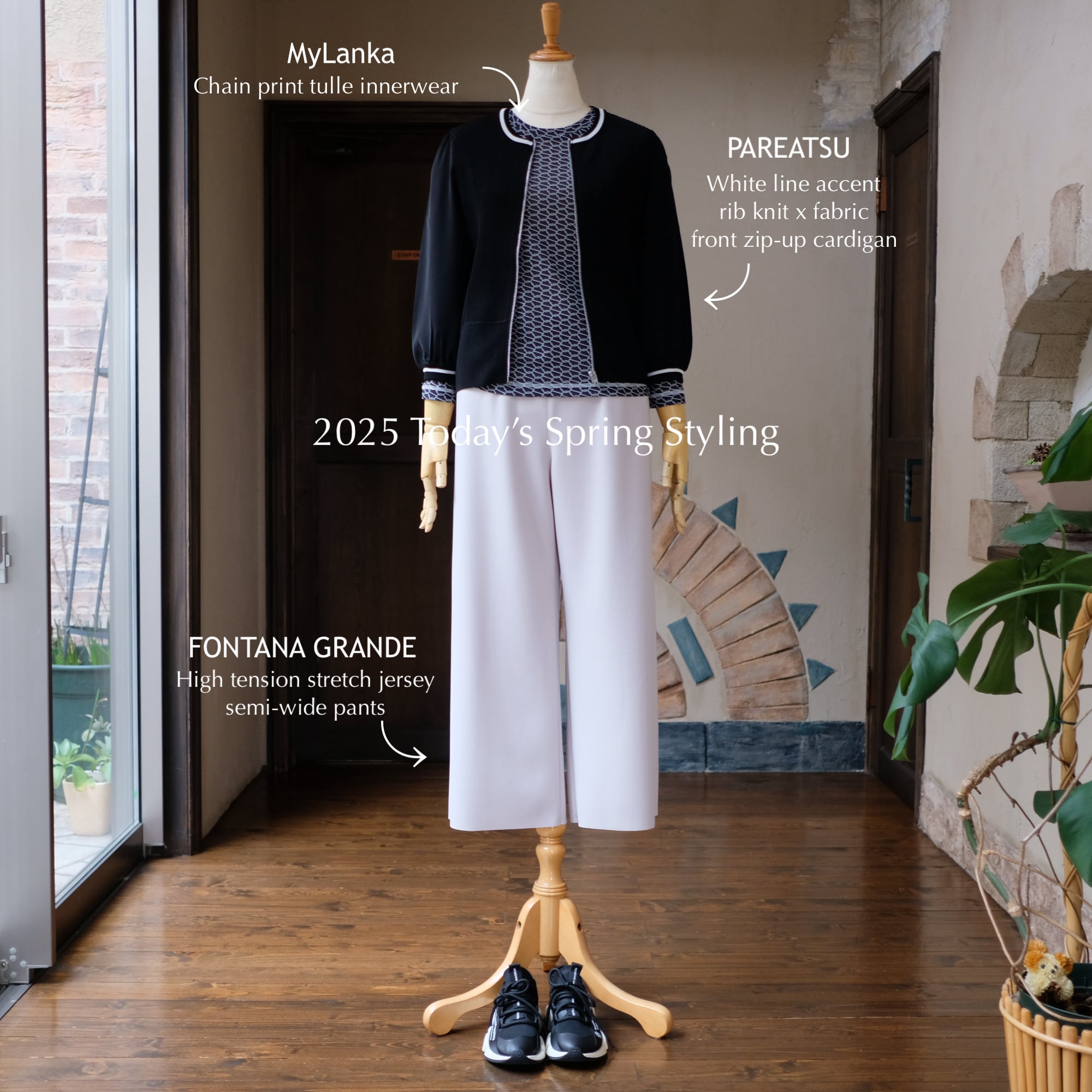 新登場の「FONTANA GRANDE ハイテンションストレッチジャージィセミワイドパンツ」は、イージィケアと快適な穿き心地を兼ね備えたアイテムです!シワになりにくい特性を持ち、ハンドウォッシャブルなので、日常の手入れが簡単でストレスフリーです。ウエストゴム仕様で、リラックスしたフィット感を実現しています。