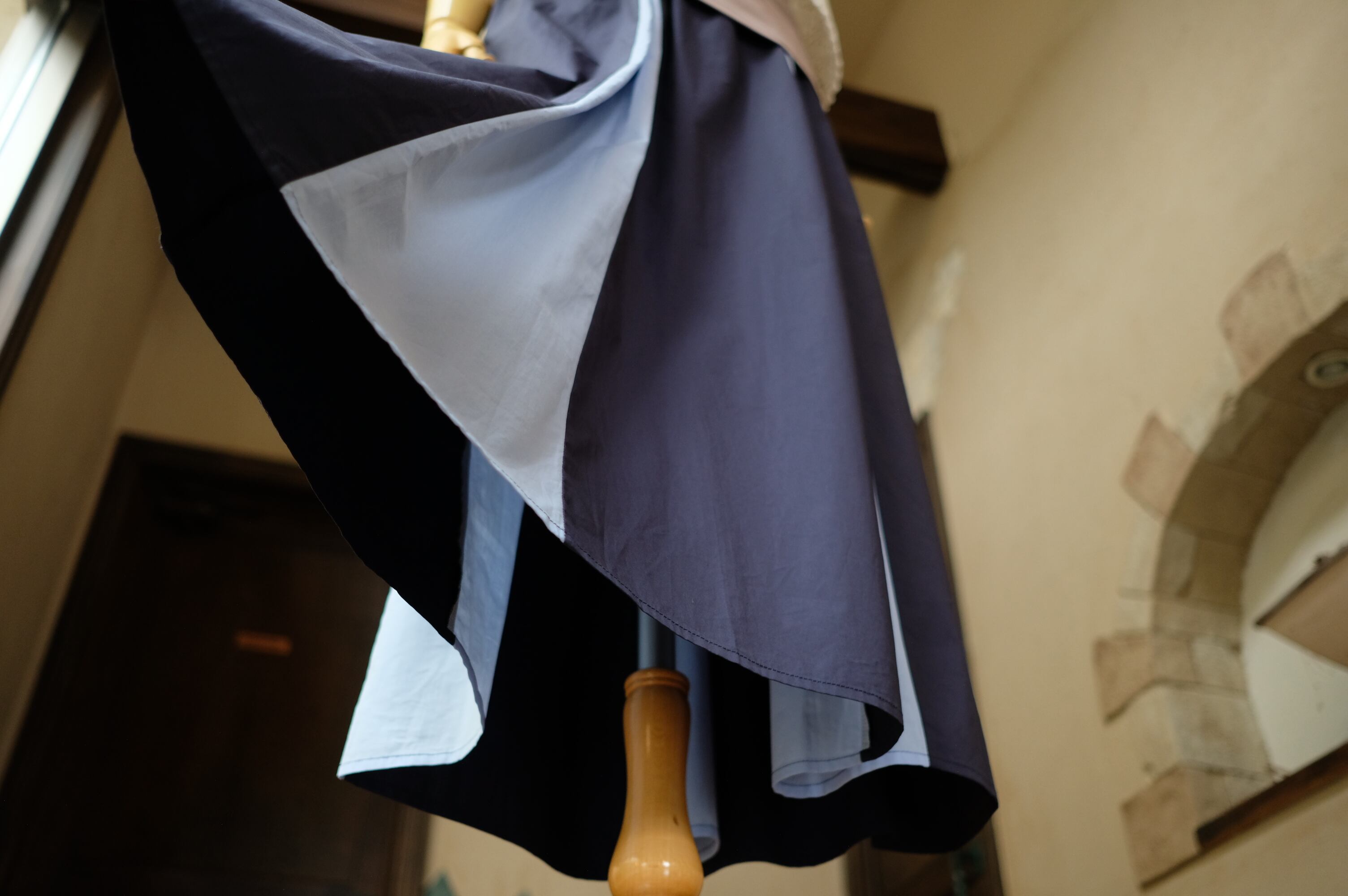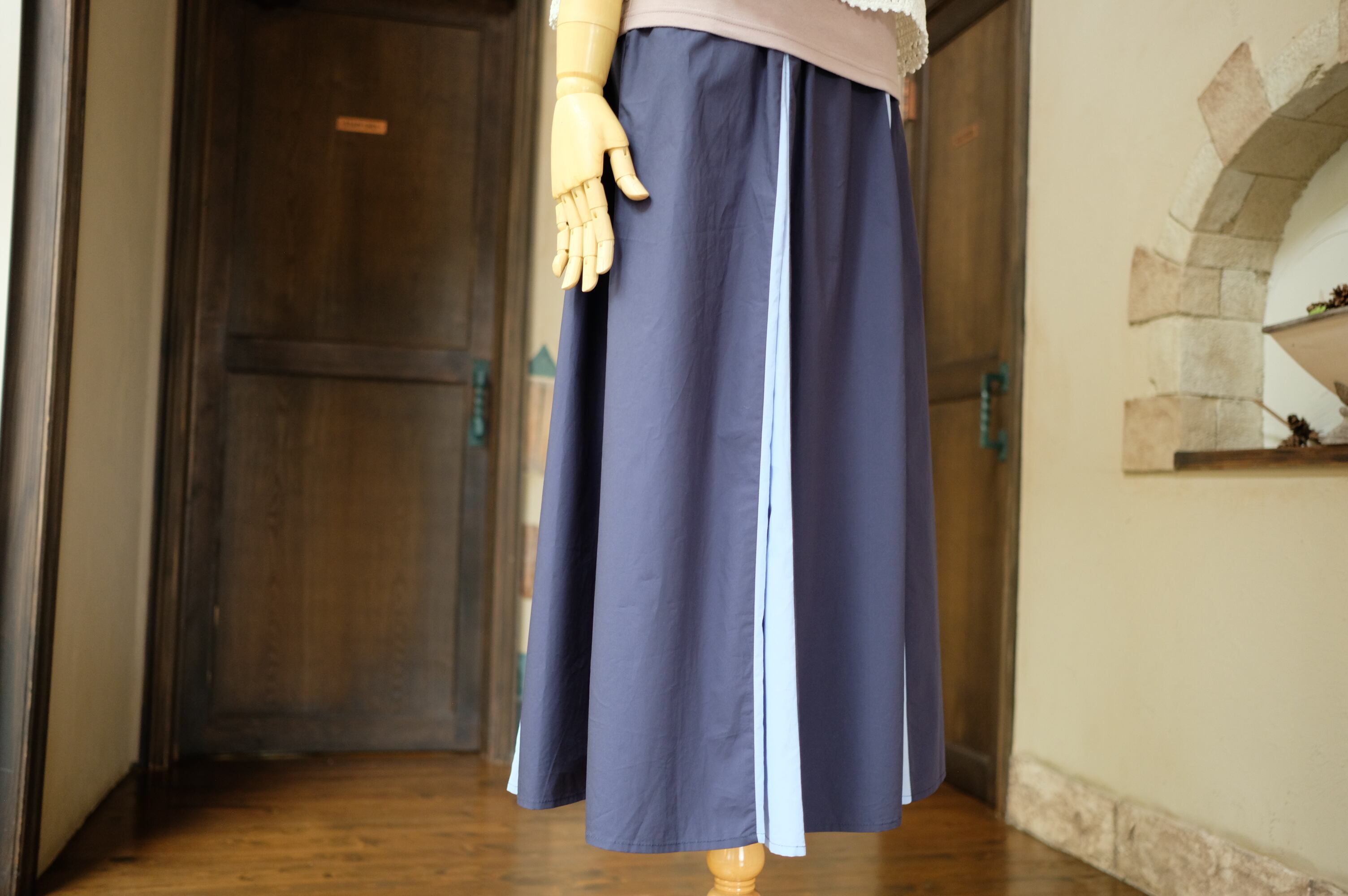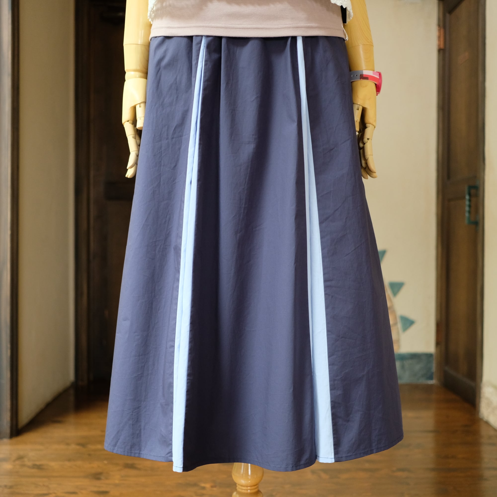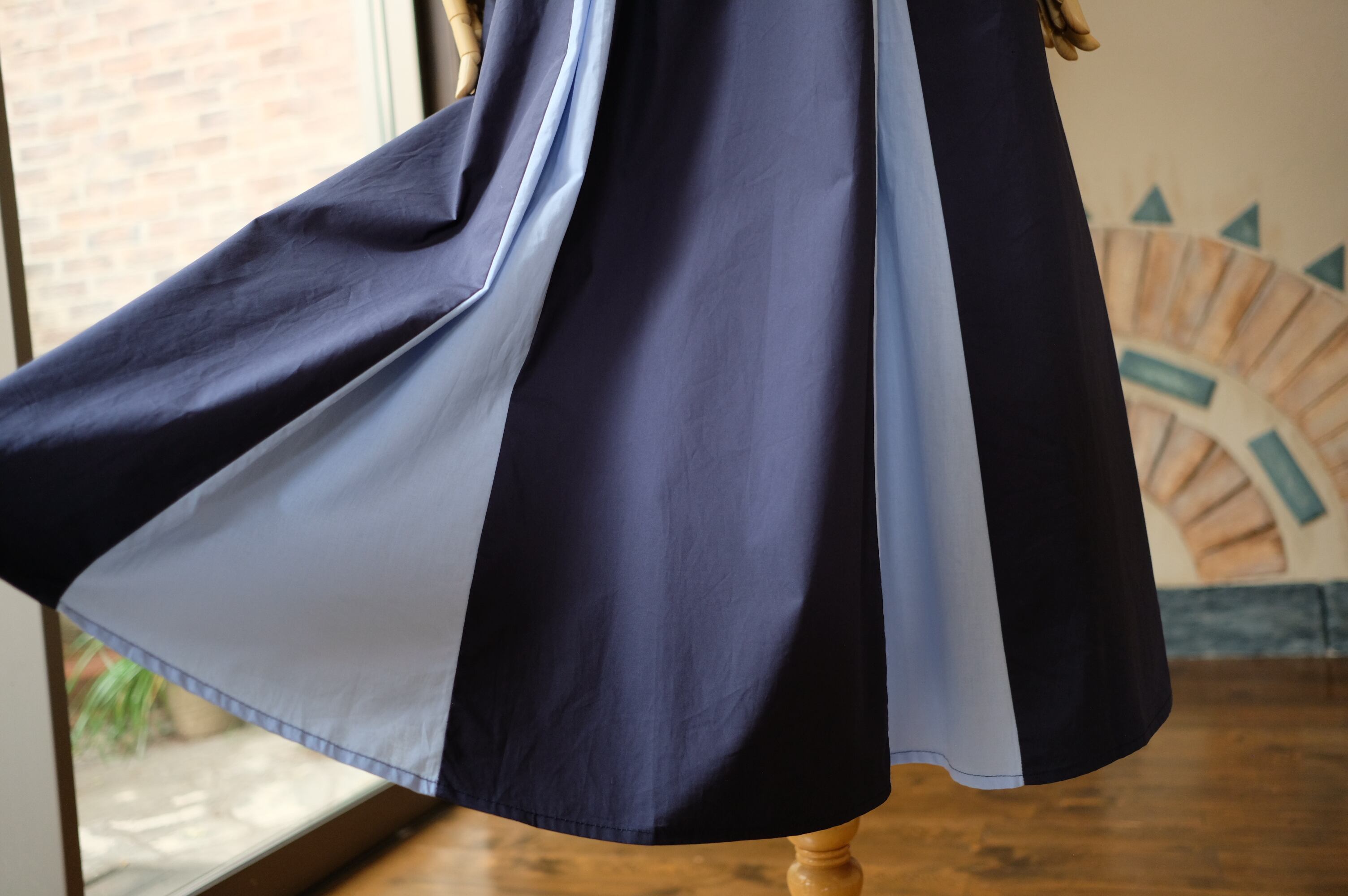 商品名:MyLanka コットンツイル×別布配色ギャザーフレアースカート<ネイビー×サックス>
