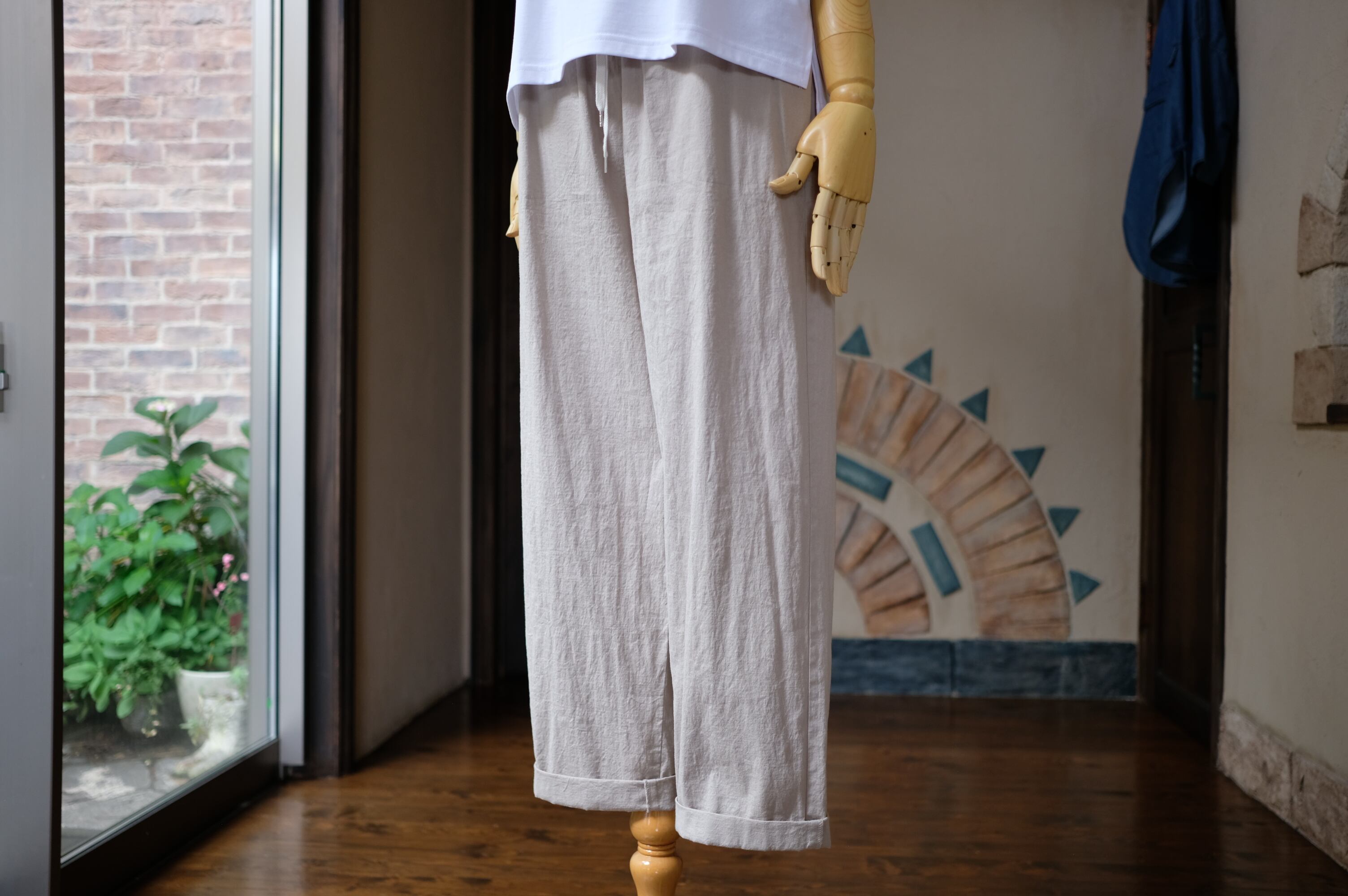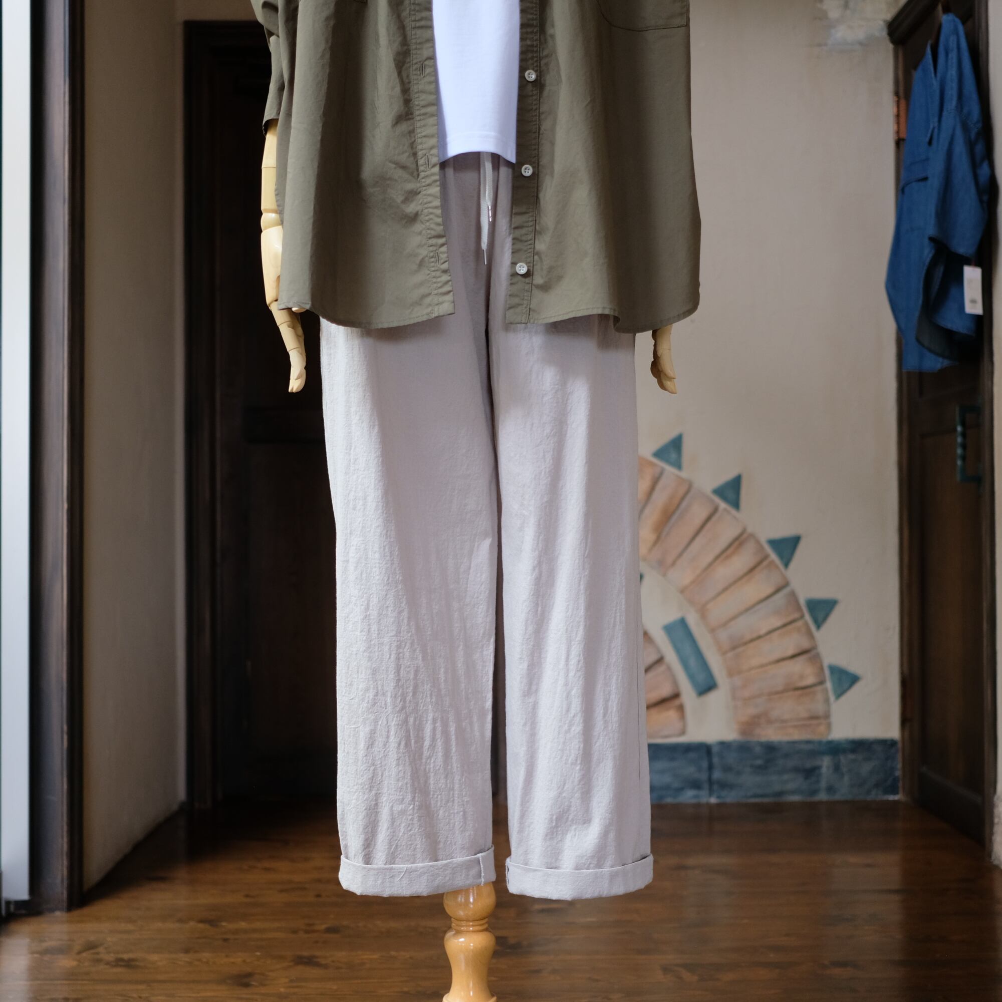 このイージーパンツの特徴は、ゆるやかなテーパードシルエットとロールアップデザインが、リラックスした雰囲気を演出しつつも、すっきりとした印象を与える点です。普段使いはもちろん、ちょっとしたお出かけにも最適で、デイリーコーディネートに華を添えるアイテムとなっています!