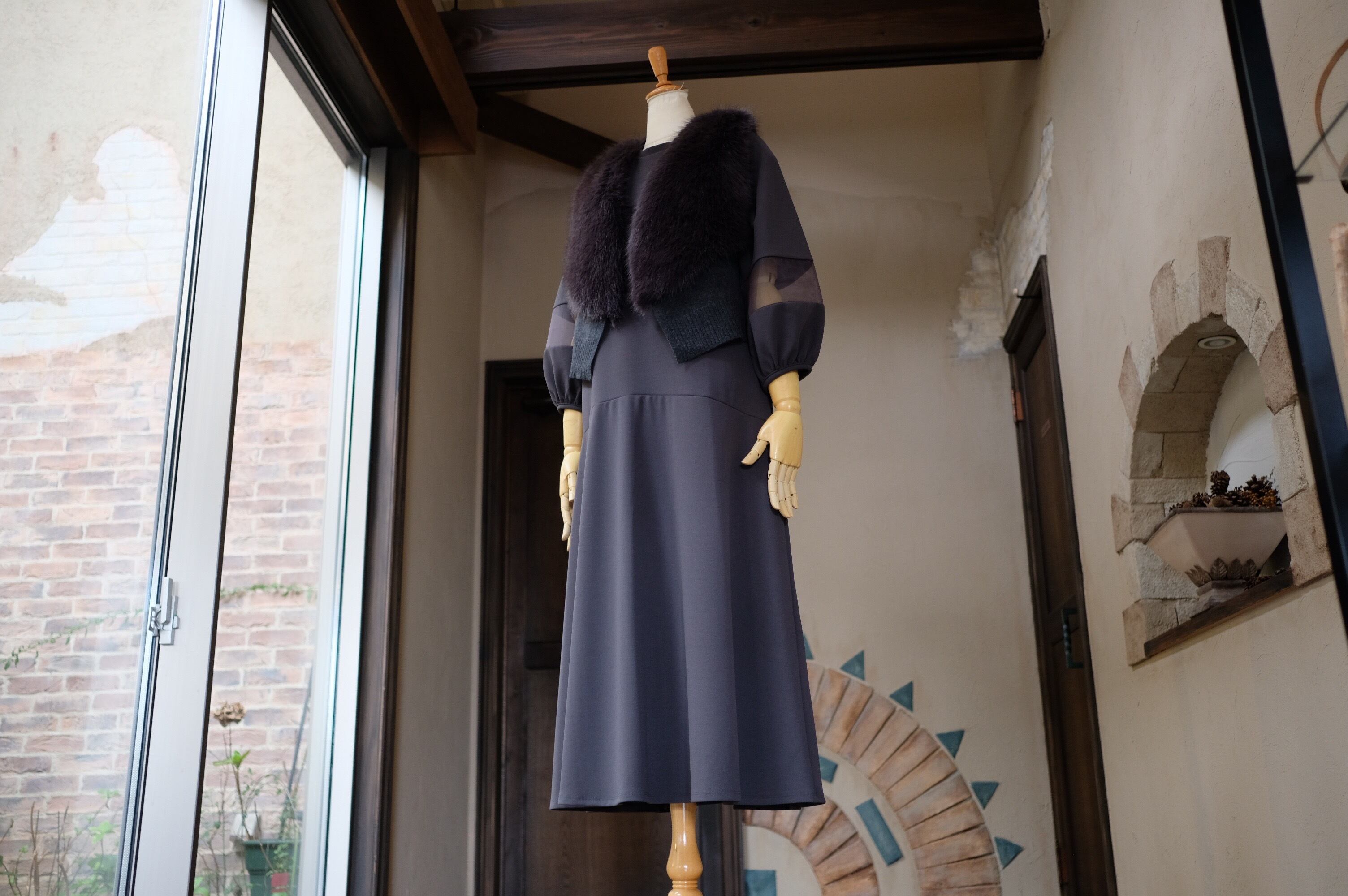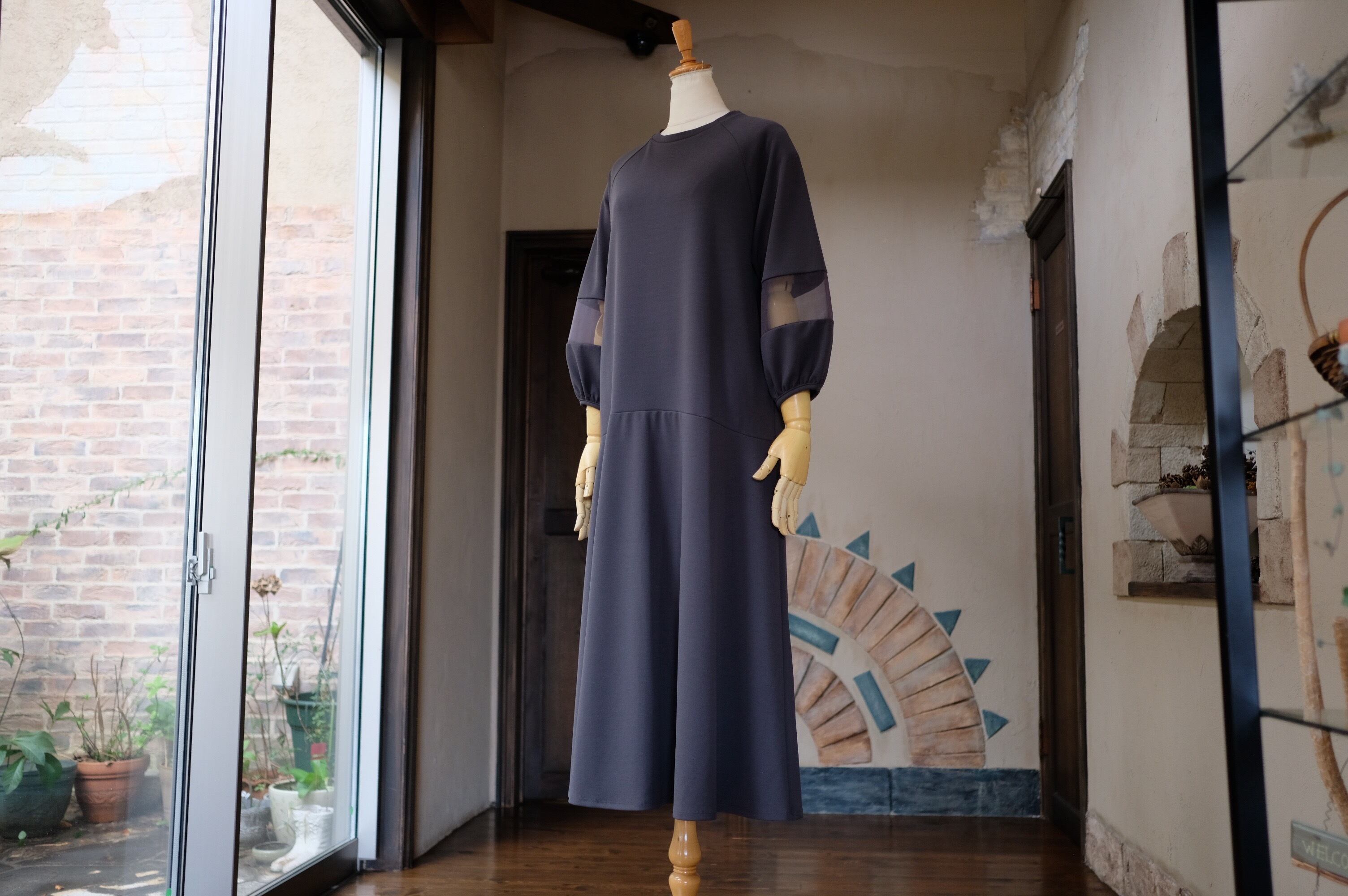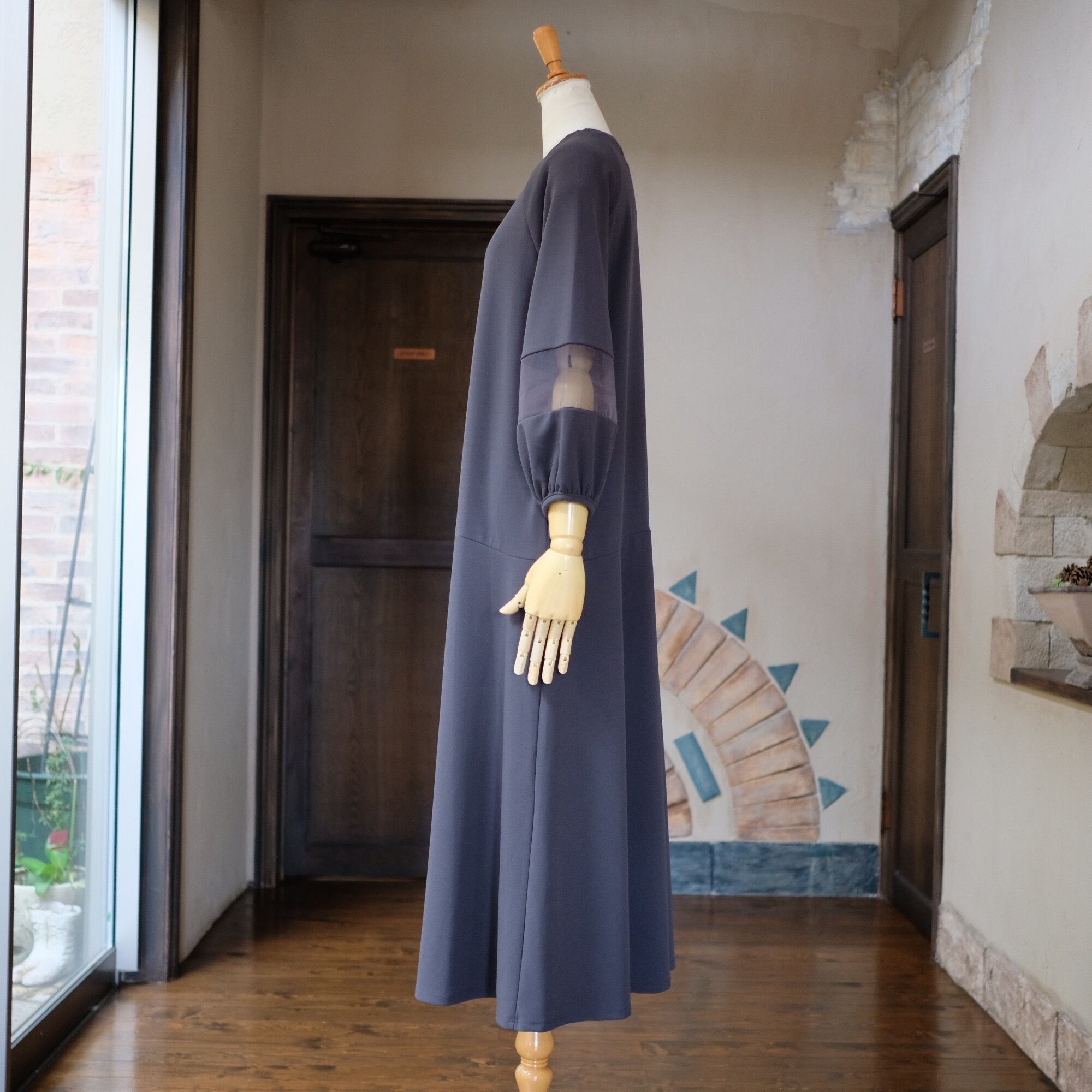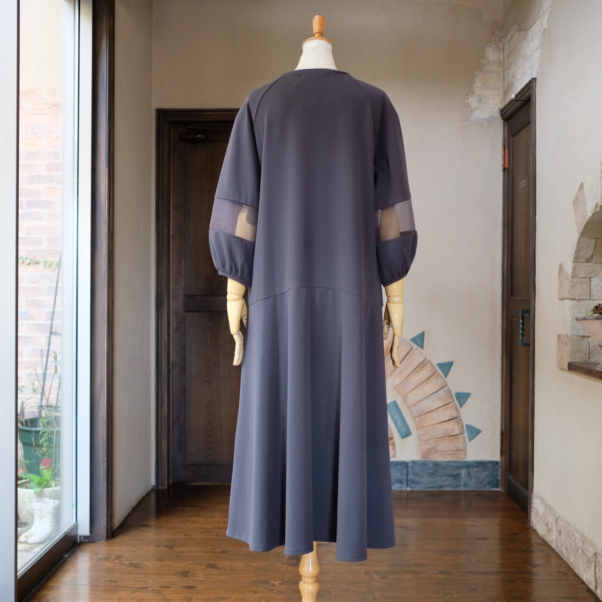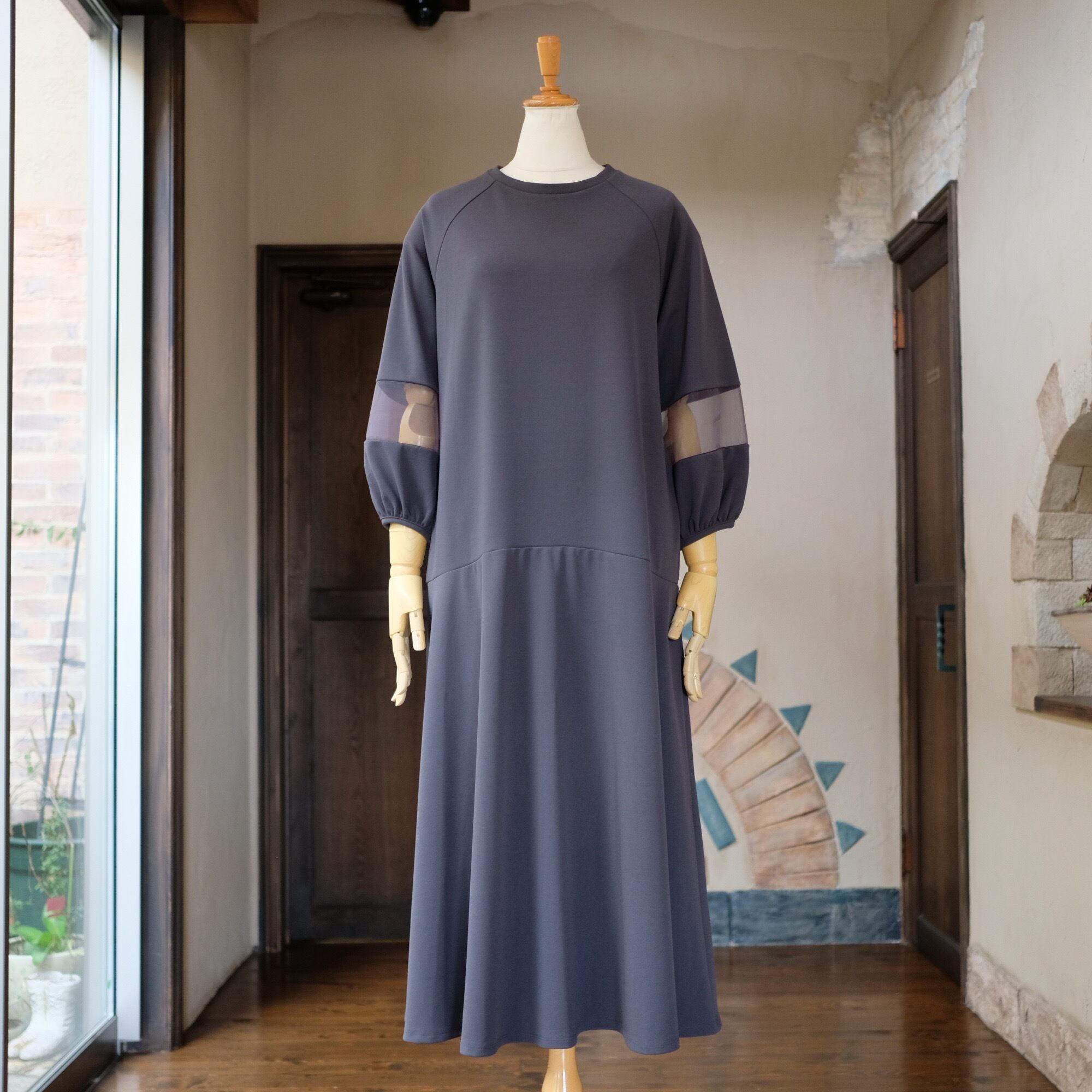 【BRAHMIN】オーガンジー切り替えスリーブフレアーワンピース<チャコールグレー>
