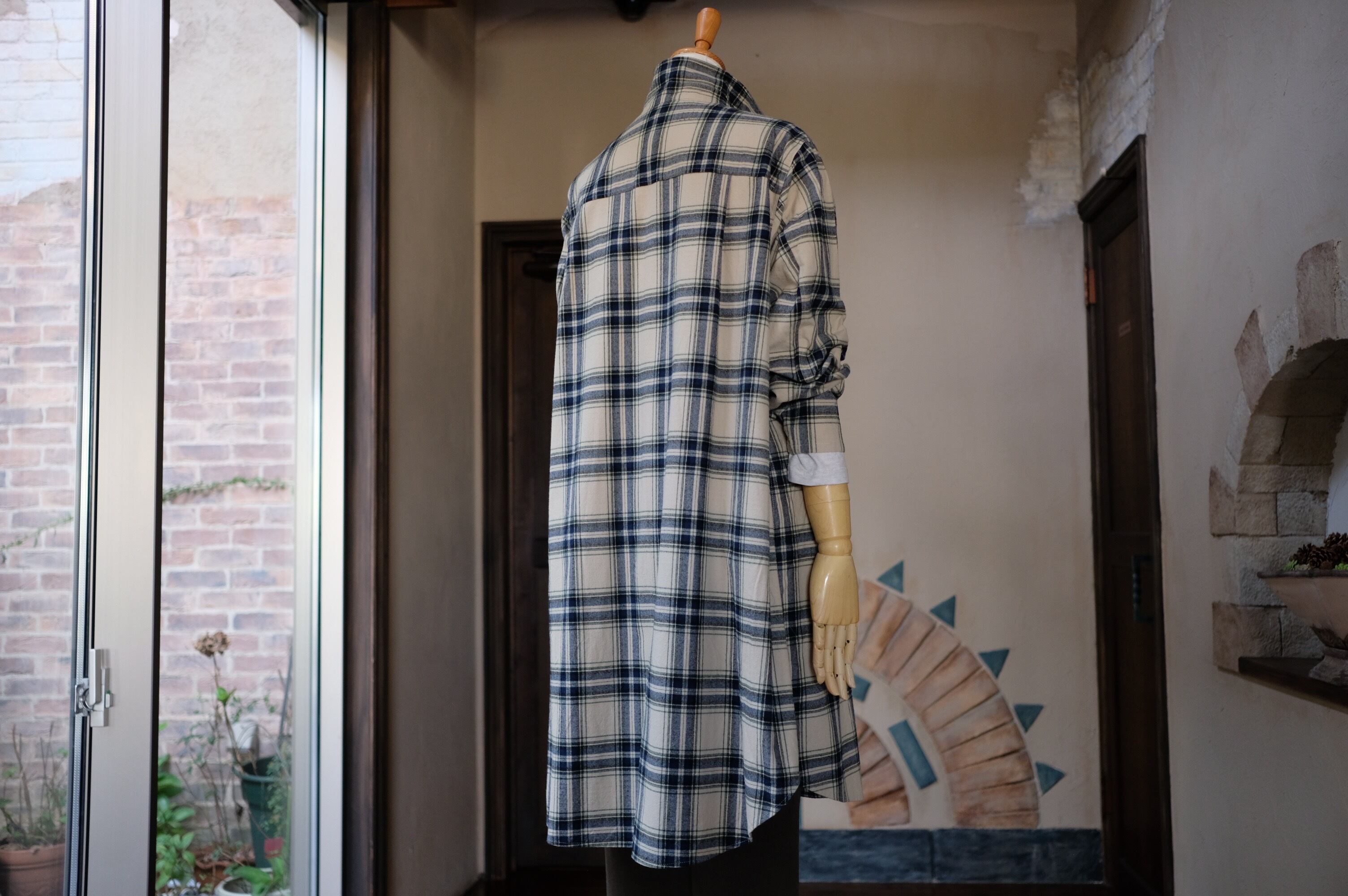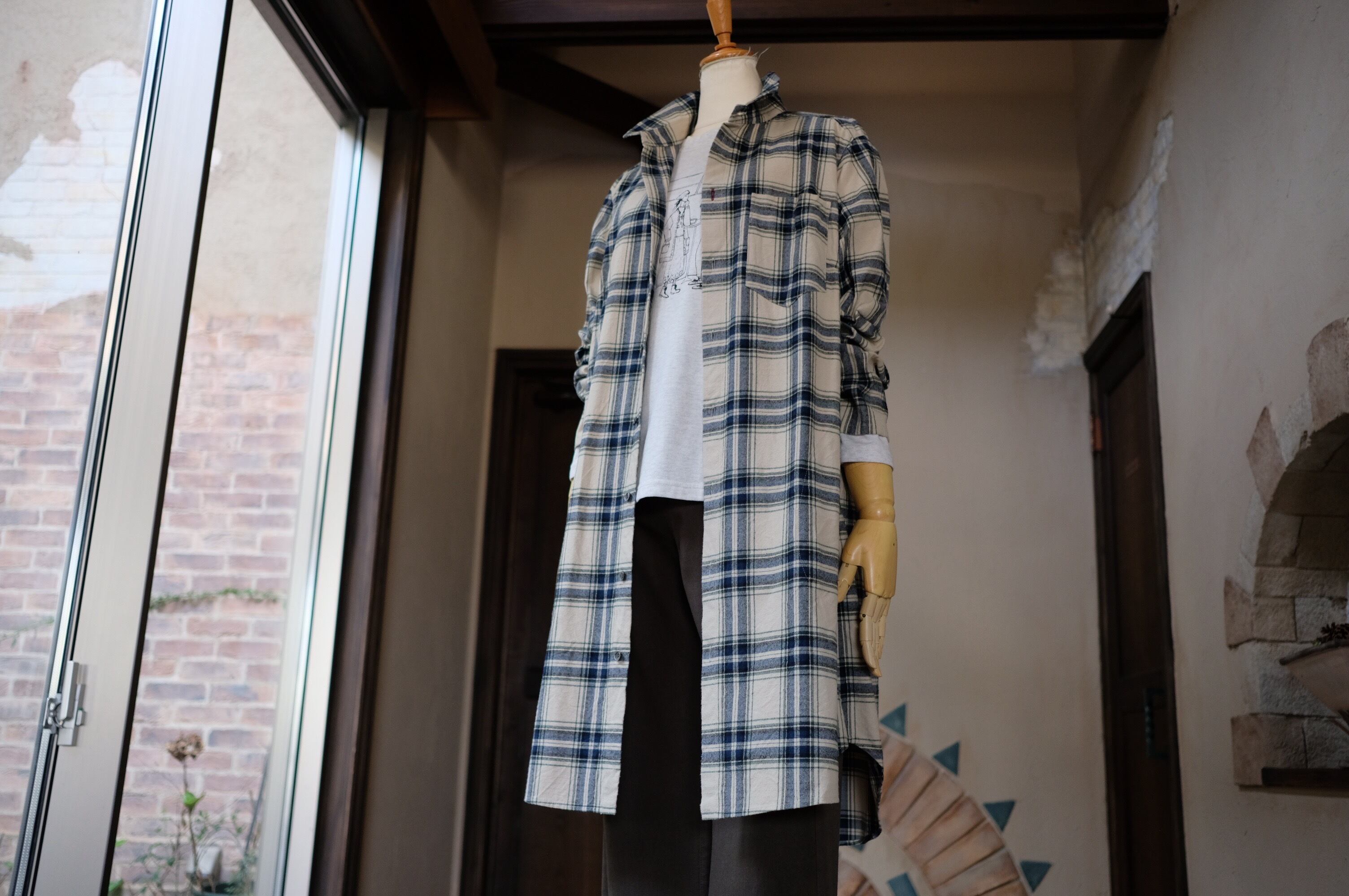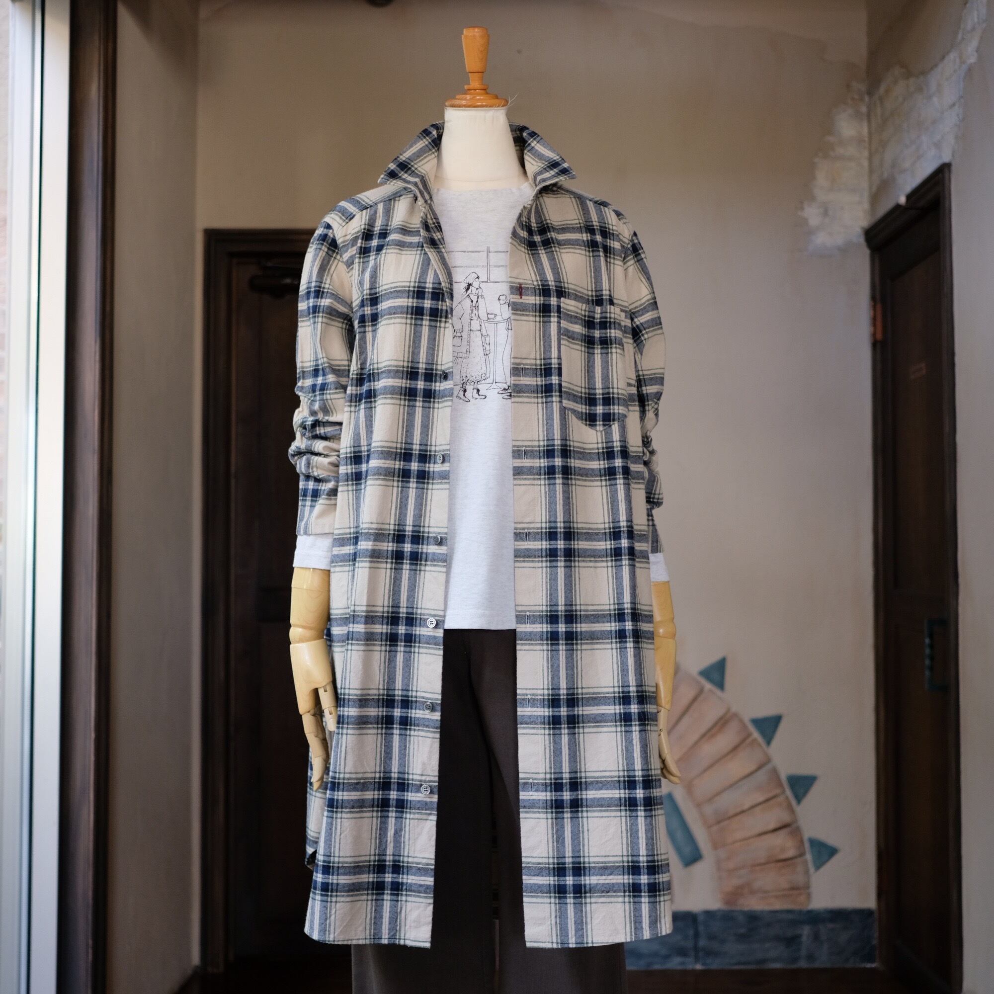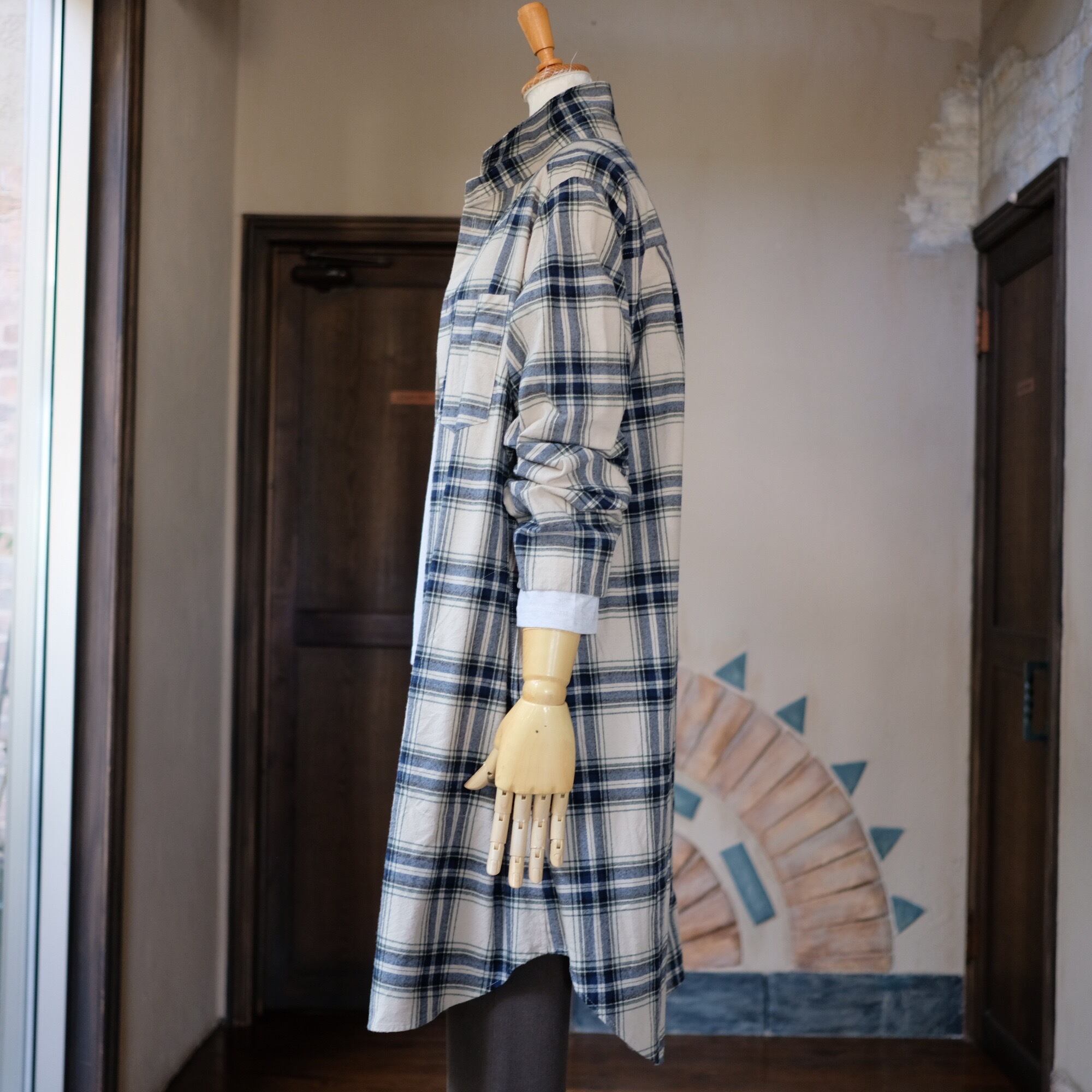 【CO’s】ヴィンテージ風表起毛先染めチェックロングシャツ<ライトベージュベース>