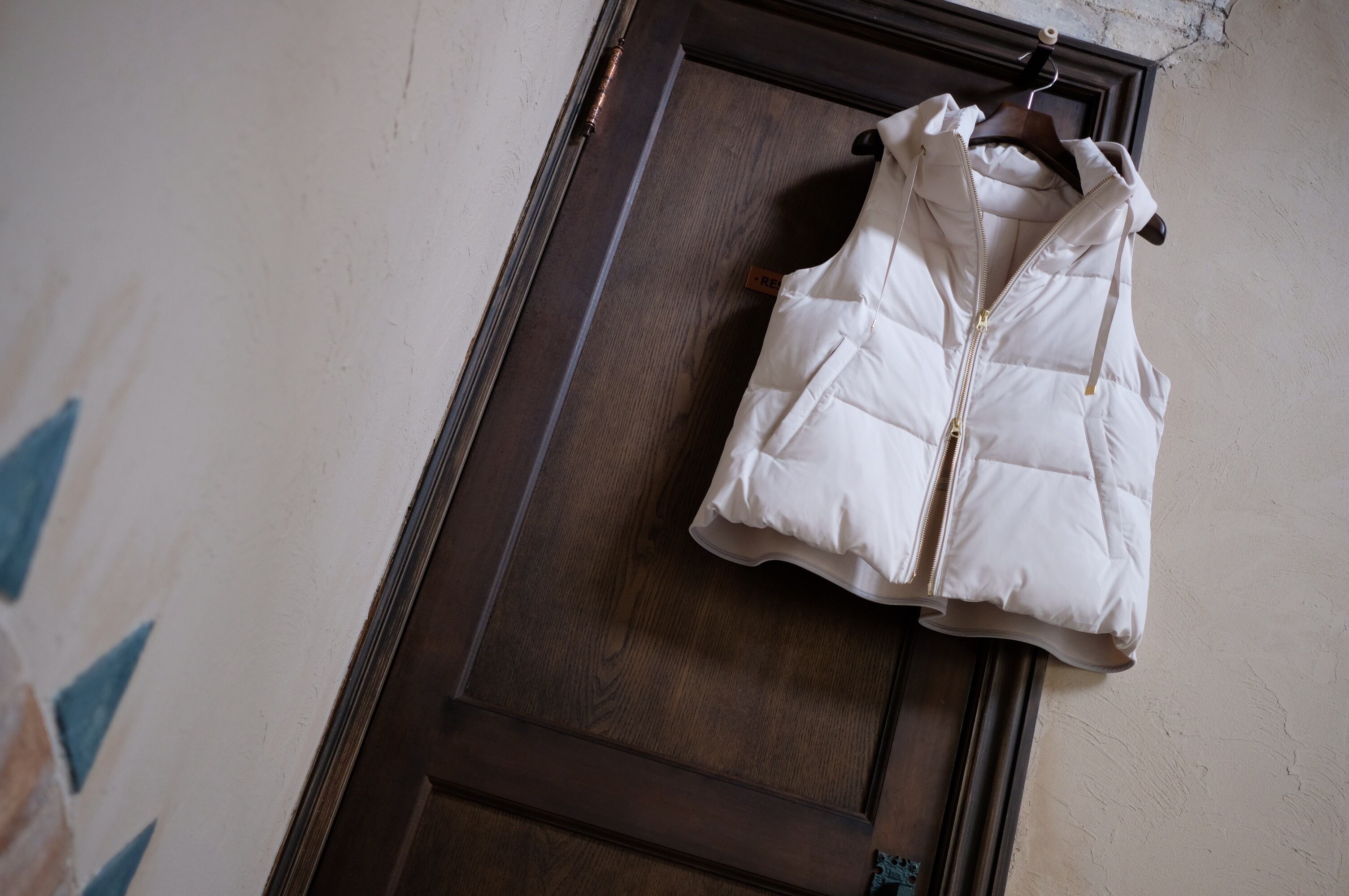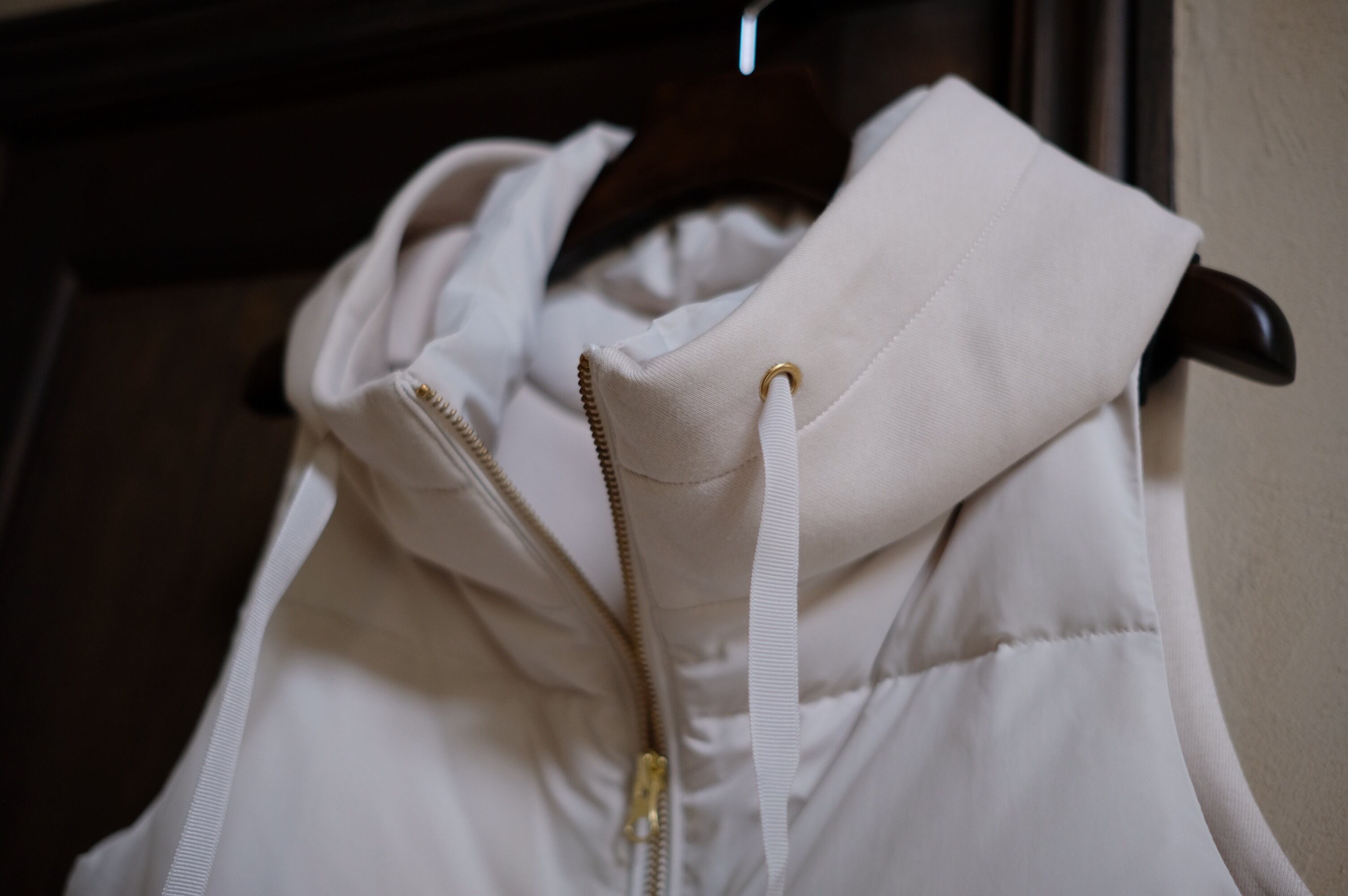 商品名:【PASSIONE】ちびフード風衿フロントダウンベスト<ライトベージュ>