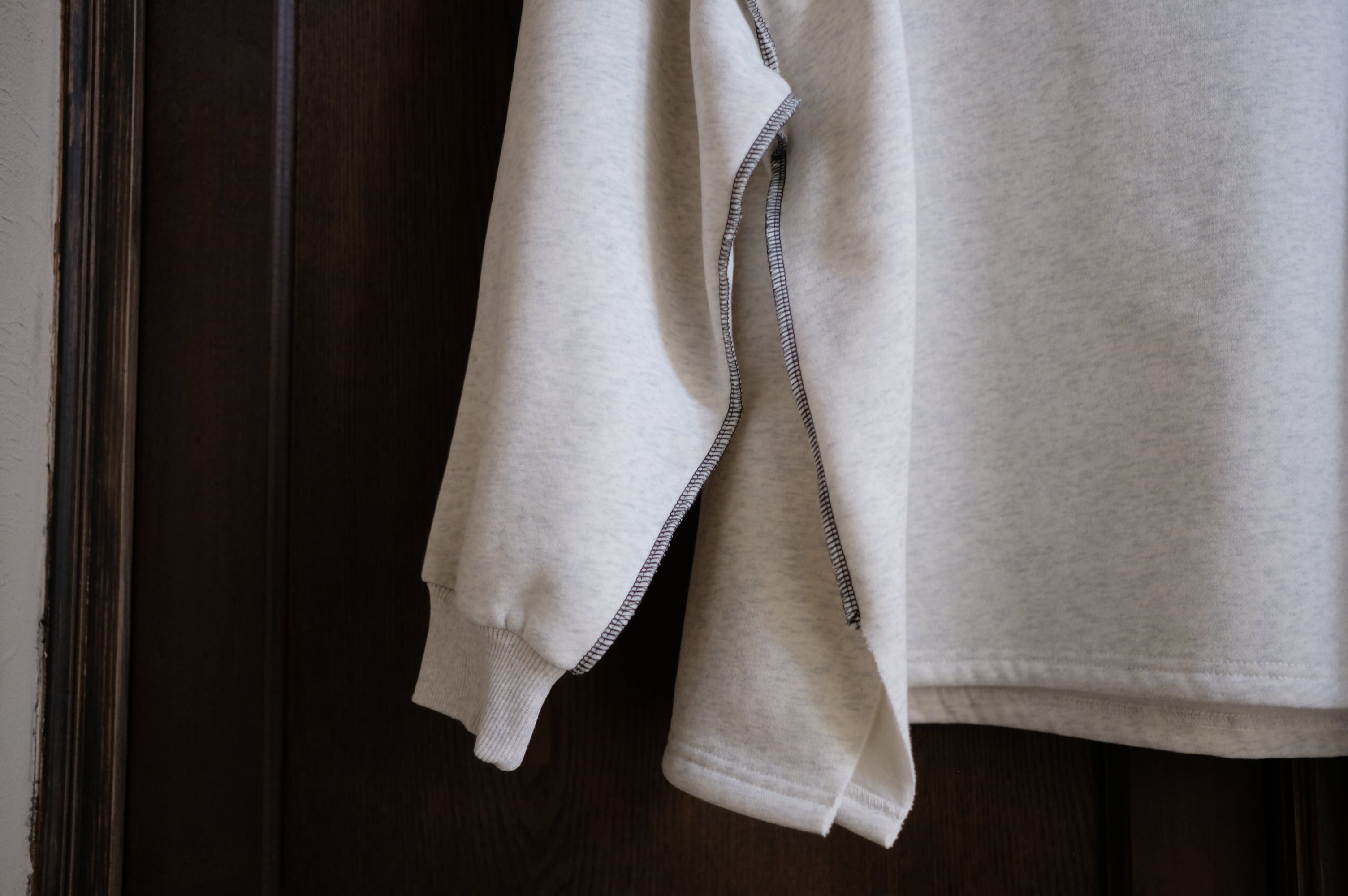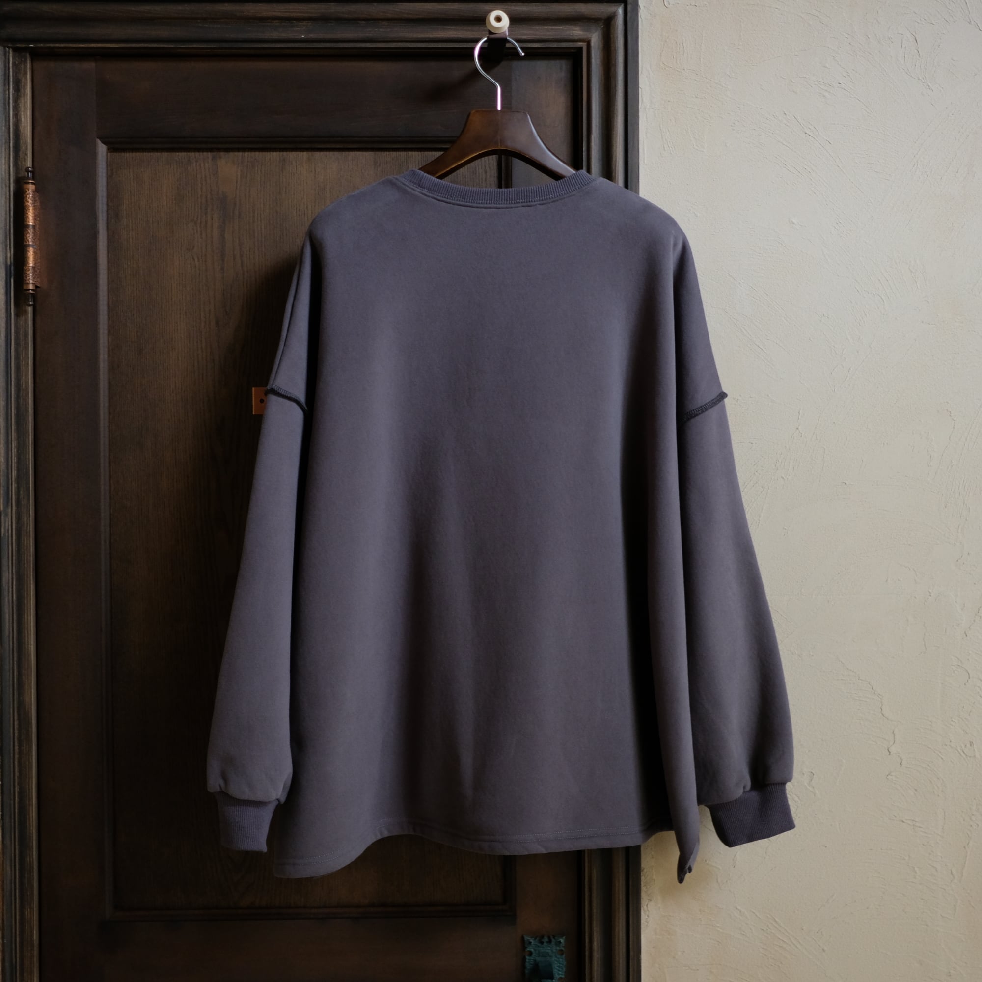 切り替え部分にはロックステッチが施されており、シンプルながらもアクセントのあるデザインとなっています。重ね着にも最適で、リラックスした雰囲気を演出します。