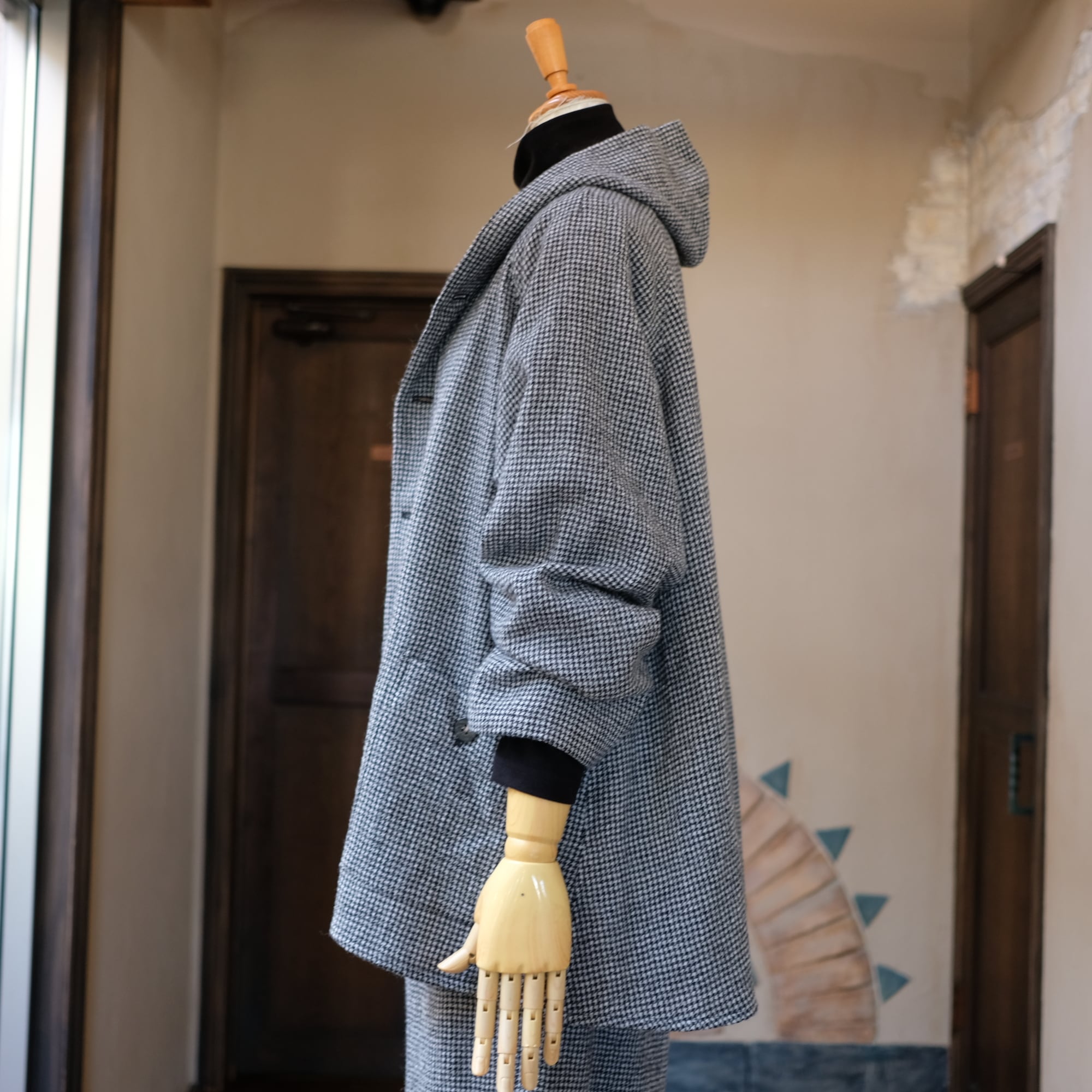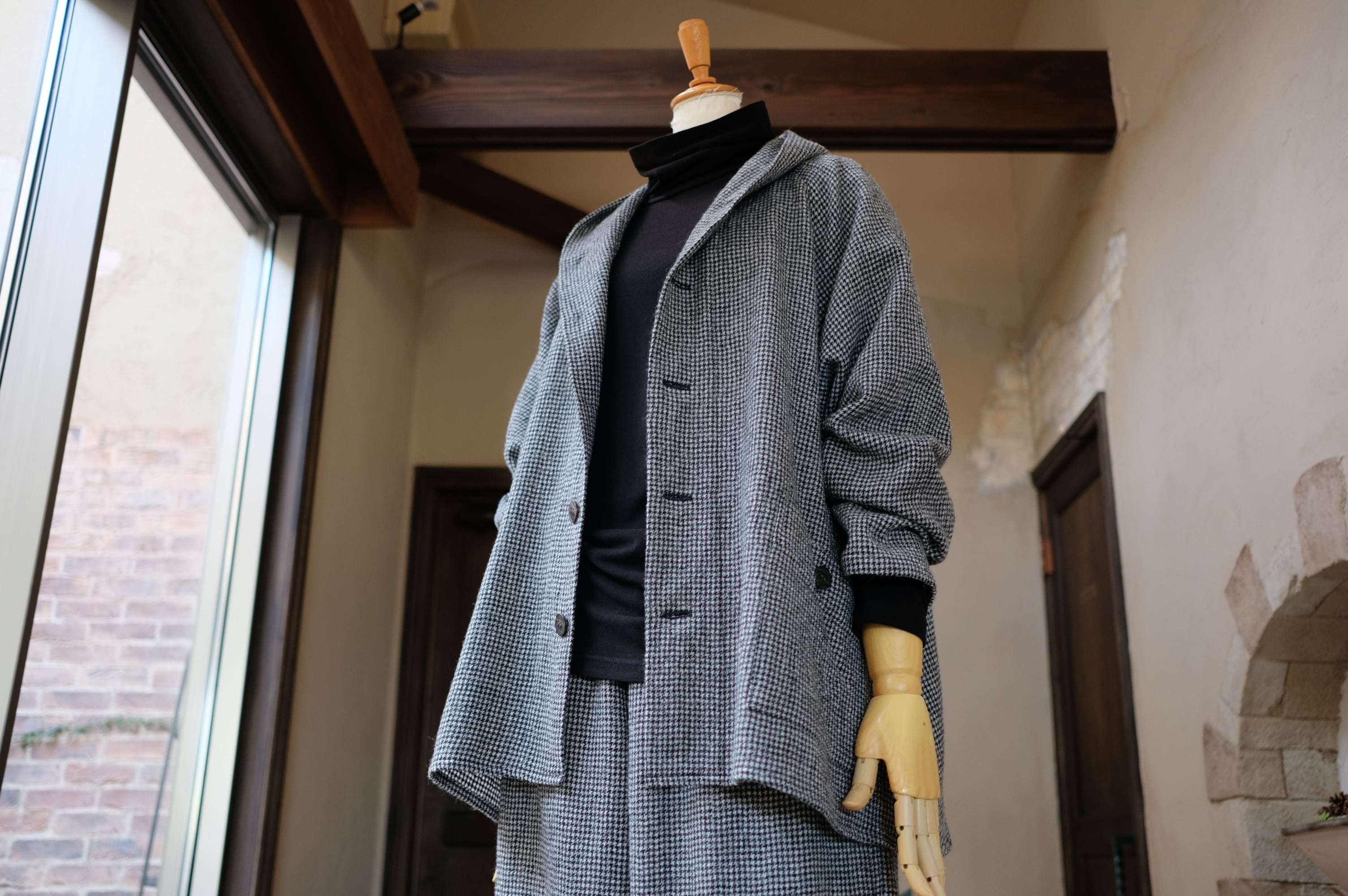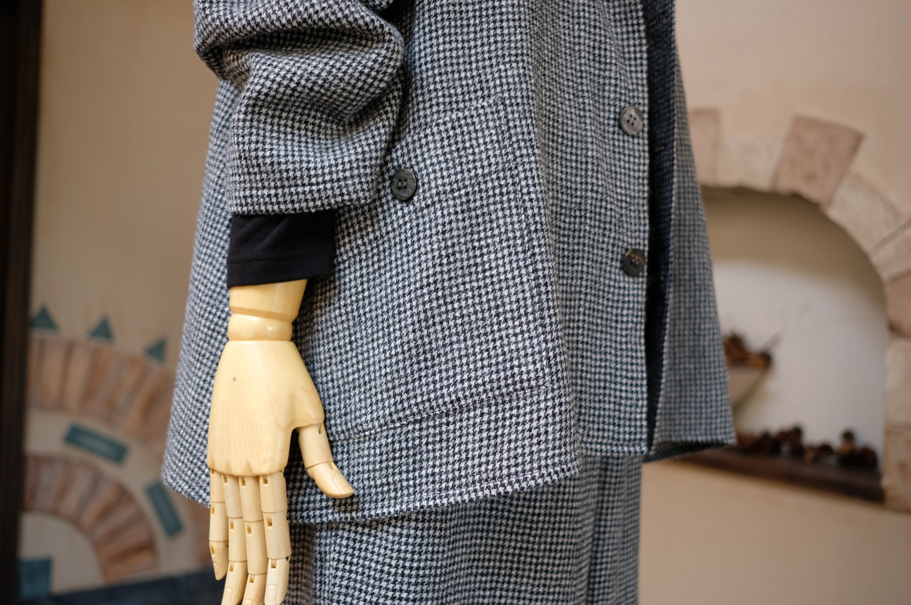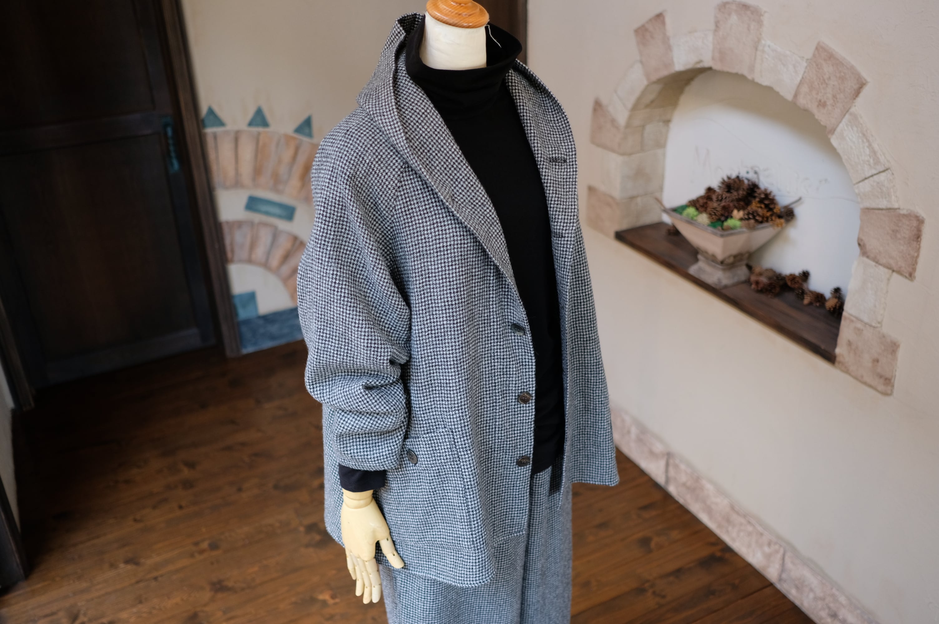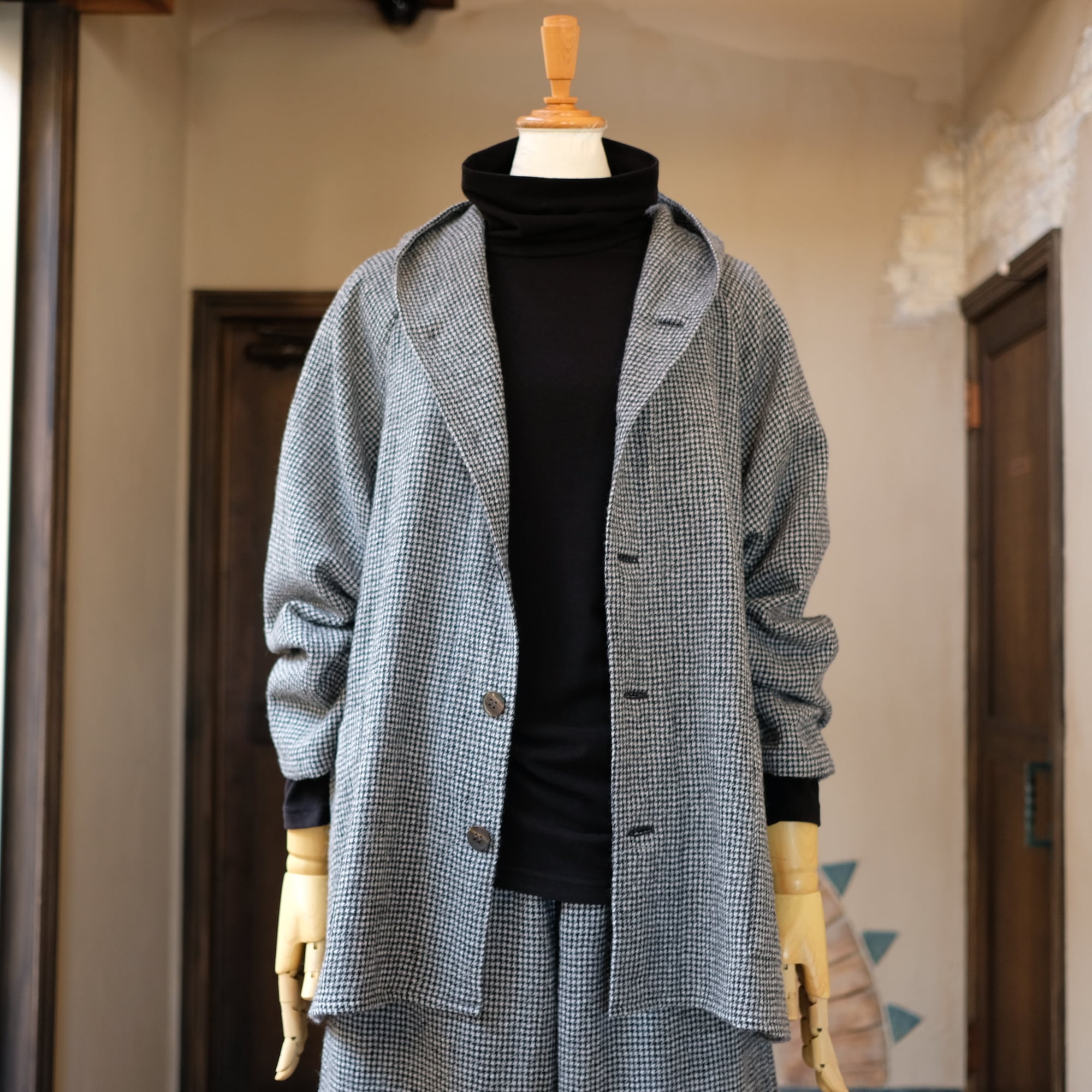 新たなシーズンに向けて、「【CO's】千鳥柄エアリーウールちびフード衿ジャケット」が登場です!たて糸よこ糸の打ち込みを甘く織り上げワッシャータンブラー加工を施した空気を含んだ柔らかな風合いが特徴の千鳥柄エアリーウールを使用したこのジャケットは、軽やかでありながら温かさも兼ね備えています。