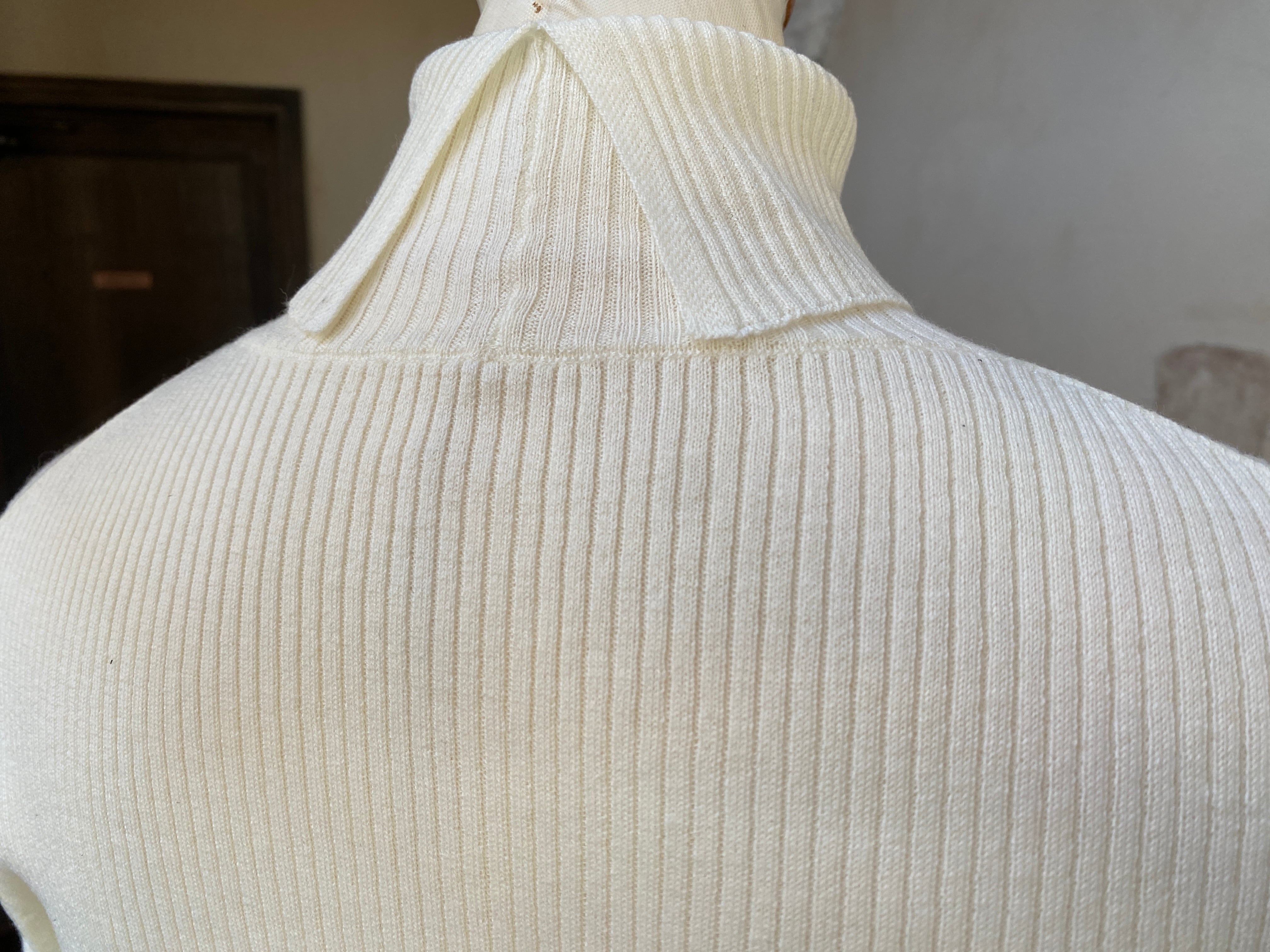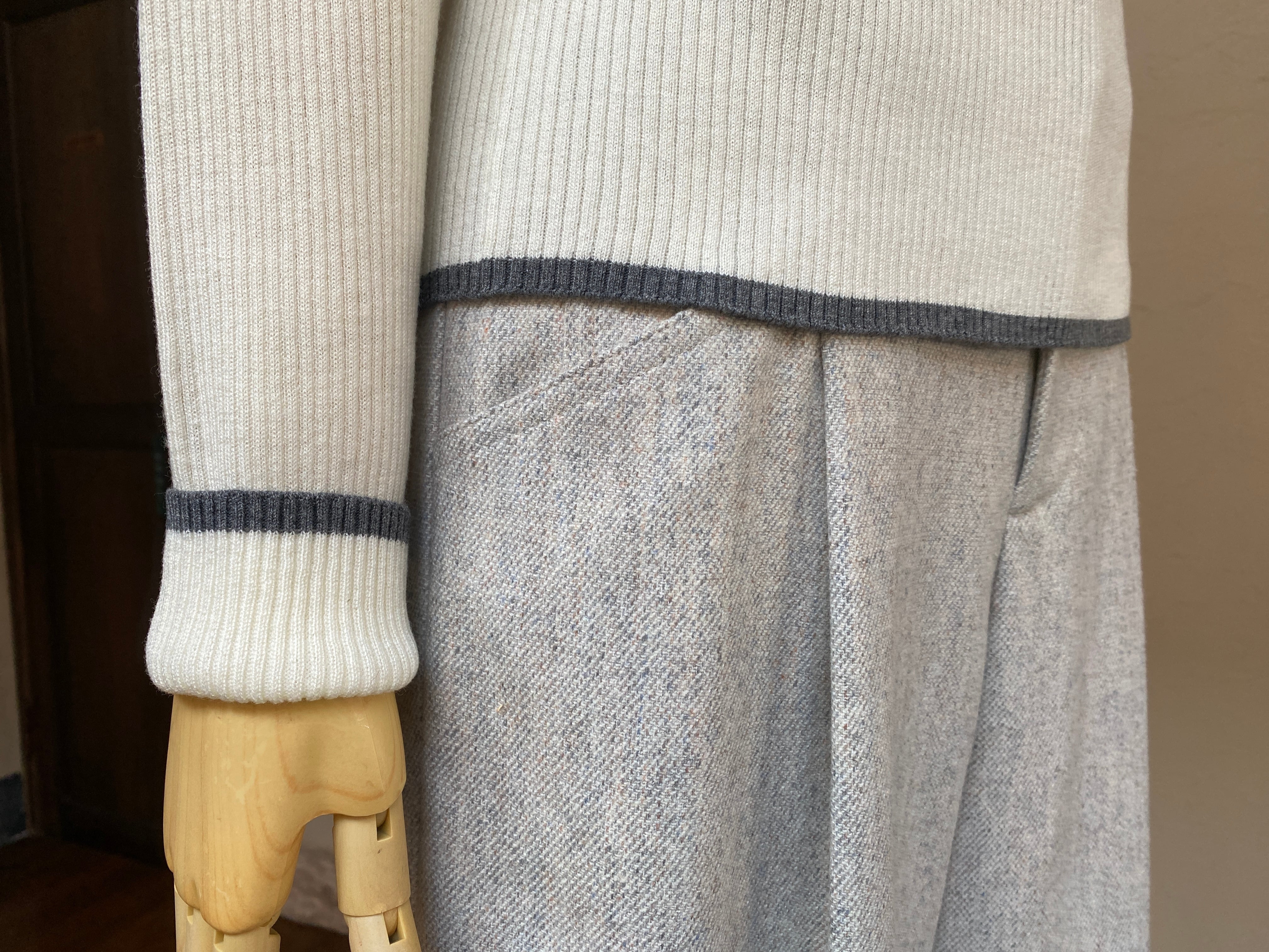 袖口と裾の配色が際立ち、シンプルながらも存在感抜群の一着です。後ろ襟のスリットデザインは、タートルネックを折り返しても、たるませてもスタイリッシュに決まります。これ一枚で、カジュアルなデイリースタイルから特別なお出かけまで、幅広いシーンで活躍します。