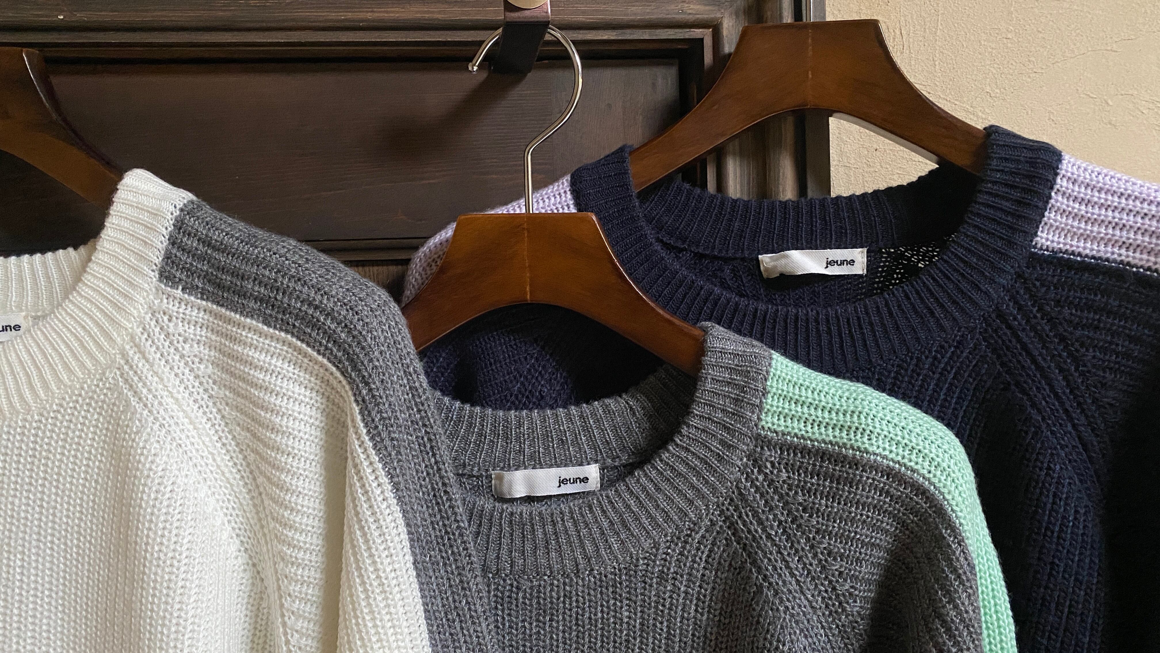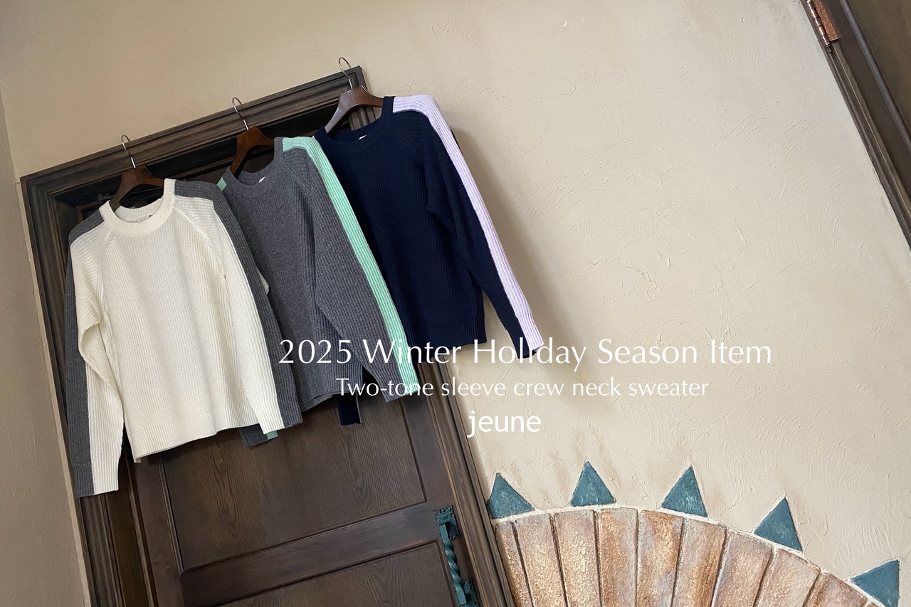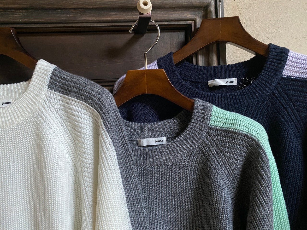 新たなシーズンに向けて、「【jeune】バイカラー切替スリーブクルーネックセーター」が登場です!シンプルなクルーネックデザインながら、肩から袖へと映えるバイカラー切替が印象的な一着です。編み地には畔編みのウール混素材が使用されており、温かさと心地よさを感じることができます。