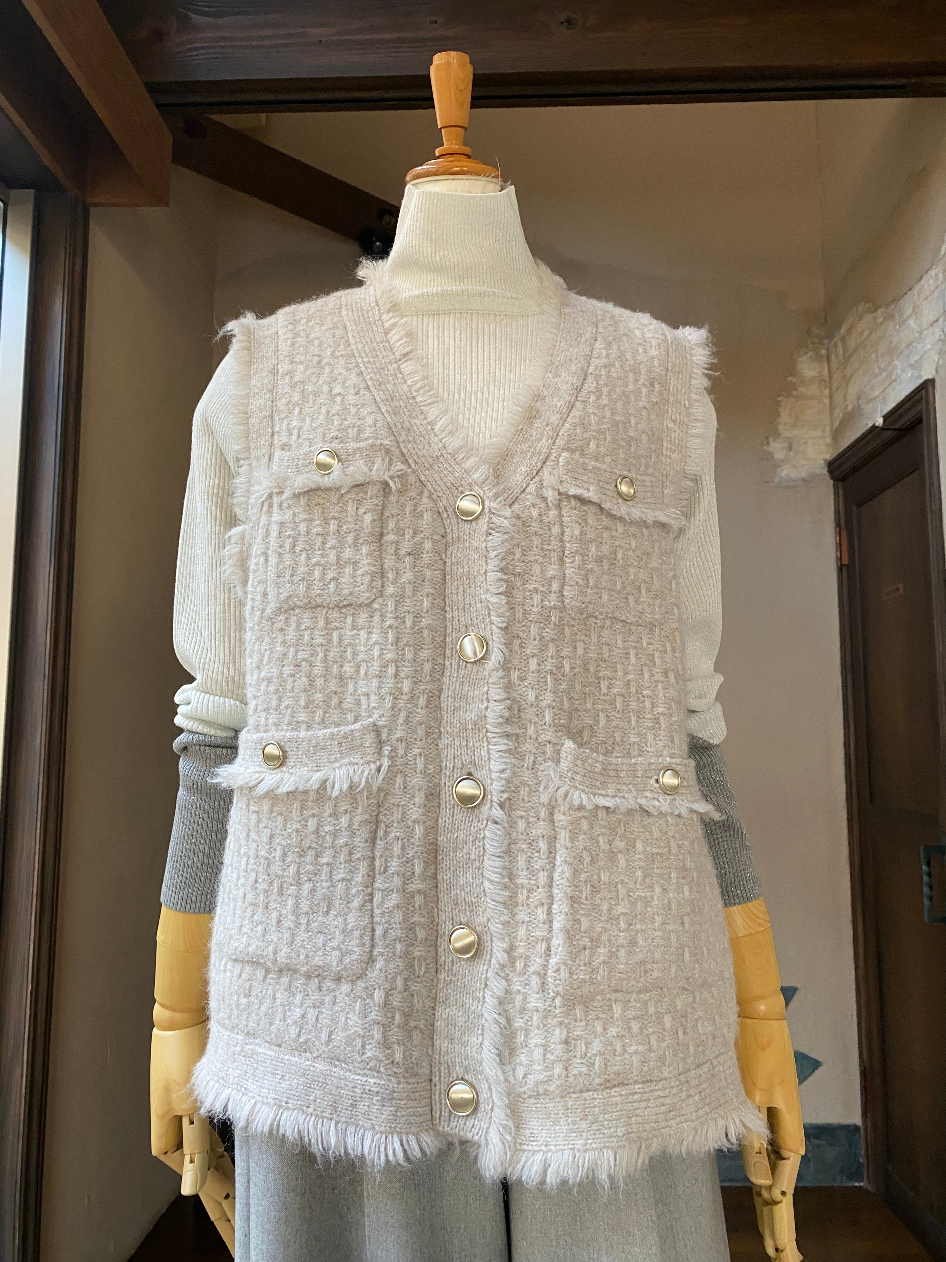 新たなシーズンに向けて、「【MyLanka】ミックスヤーンツィードライクニットジレ<ベージュ>」が登場です!華やかなMIX糸を使用した柔らかく上品なデザインが特徴で、フリンジとゴールドボタンが魅力的に映える一着です。